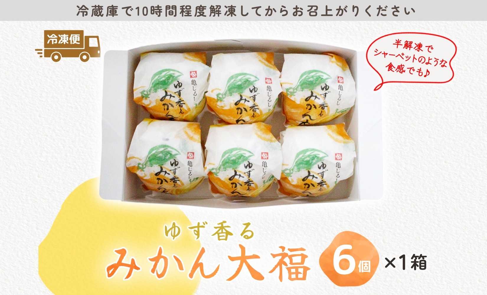 半解凍で爽やかシャリシャリ食感の「ゆず香るみかん大福」。 ゆず香るみかん大福 6個入り【フルーツ大福 大福 和菓子 スイーツ 餅 フルーツ 柑橘 みかん ゆず おやつ 手土産 メディア掲載 お取り寄せ ギフト グルメ 贈答 冷凍 亀印製菓 茨城県 水戸市】(MP-3)