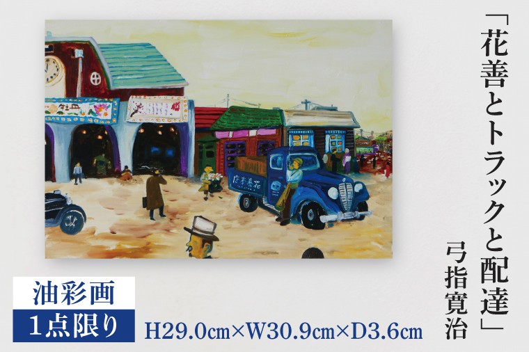| 容量 | 油彩画(背面に直筆で作家名・タイトル・制作年月日を明記) ■タイトル:花善とトラックと配達 ■制作年・場所:2025年4月22日、水戸市内の特設アトリエで制作 ■寸法:H29.0㎝×W30.9㎝×D3.6㎝ ■材質:油彩、木製パネル |