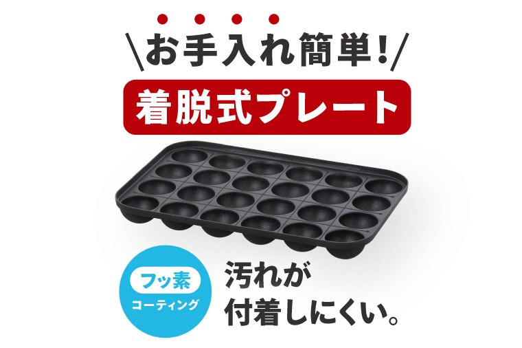 お手入れ簡単な着脱式プレートで、プレートは丸洗い対応。たこ焼きは1度に24個調理可能。