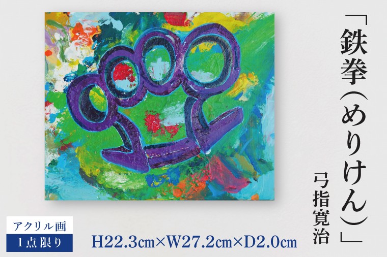 | 容量 | アクリル画(背面に直筆で作家名・タイトル・制作年月日を明記) ■タイトル:鉄拳 ■制作年・場所:2025年7月、水戸市内の特設アトリエで制作 ■寸法:H22.3㎝×W27.2㎝×D2.0㎝ ■材質:アクリル、新聞、木製パネル |