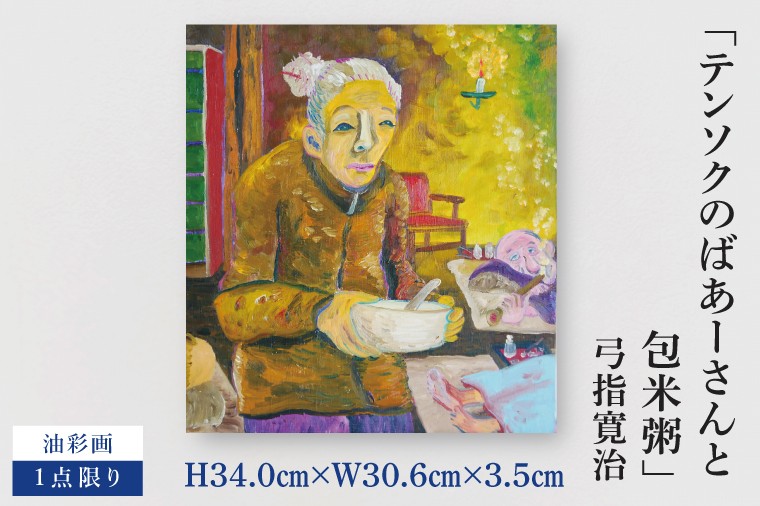 | 容量 | 油彩画(背面に直筆で作家名・タイトル・制作年月日を明記) ■タイトル:テンソクのばあーさんと包米粥(てんそくのばあーさんととうもろこしがゆ) ■制作年・場所:2025年7月、水戸市内の特設アトリエで制作 ■寸法:H34.0㎝×W30.6㎝×3.5㎝ ■材質:油彩、木枠パネル |