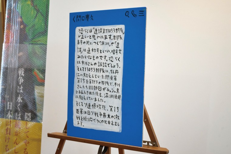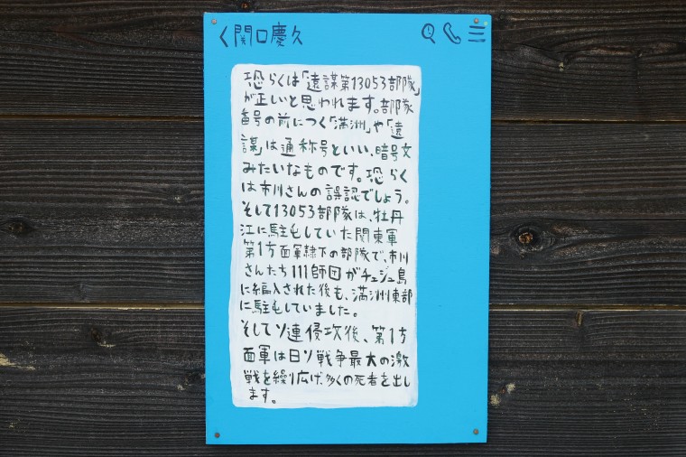 館長の関口さんは僕の質問以上のことを調べてくれました。それは満州13053部隊というのが実は遠謀13053部隊という名前であったことや、それがなぜそういう読み方になっているのか、さらに13053部隊というのが済州島に行った部隊だけじゃなくて、もう一つ満州に留まった部隊があって、その部隊がどうなったか、想像した範囲を超えて調べてくれました。