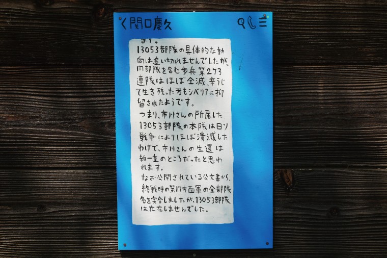 館長の関口さんが調べた結果、13053部隊というのは具体的な動向を追いきれなかったそうですが、記録に残っている限り、市川力三さんが最初に所属していた満州の部隊は全滅していて、生き残った人もシベリアに抑留されたりしている。力三さんは実はこのような可能性があった部隊にいたということが分かり、僕はかなりショックでした。