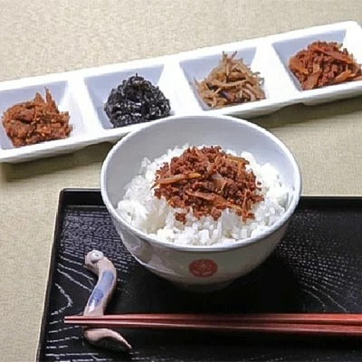 佃煮のふるさと土浦にのれんを掲げて約百年。伝統の職人技で、素材の持ち味を活かしたお造り致しております。この詰合せは、ご飯のお供に最高なしっとりとしたふりかけシリーズをお詰合せしました。炙った海苔と、あおさの香りが濃厚な無添加仕上げの海苔佃煮『のりすけ』を始め、当地土浦の幻の銘柄牛と、地元産の笹がき牛蒡の香りが食欲をそそる『飯村牛そぼろ』は大人気品です。その他、ちりめん山椒『おじゃこさん』と、七種類の食感と香りが絶妙な『七福さん』計4種類を詰合せました。
