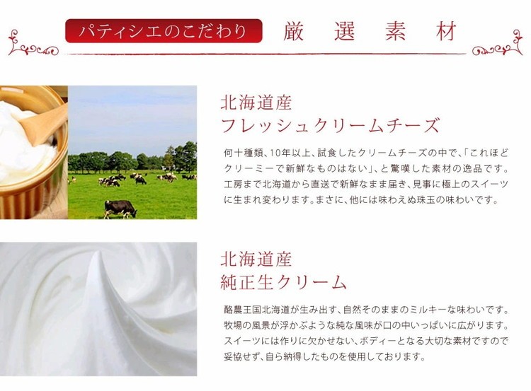 クリームチーズ、砂糖、生クリーム、ヨーグルト、マンゴー、小麦粉、バター、マーガリン、鶏卵、アーモンド、ゼラチン、ブランデー、塩、(原材料の一部に乳成分・小麦・卵・アーモンド・ゼラチン・大豆を含む)