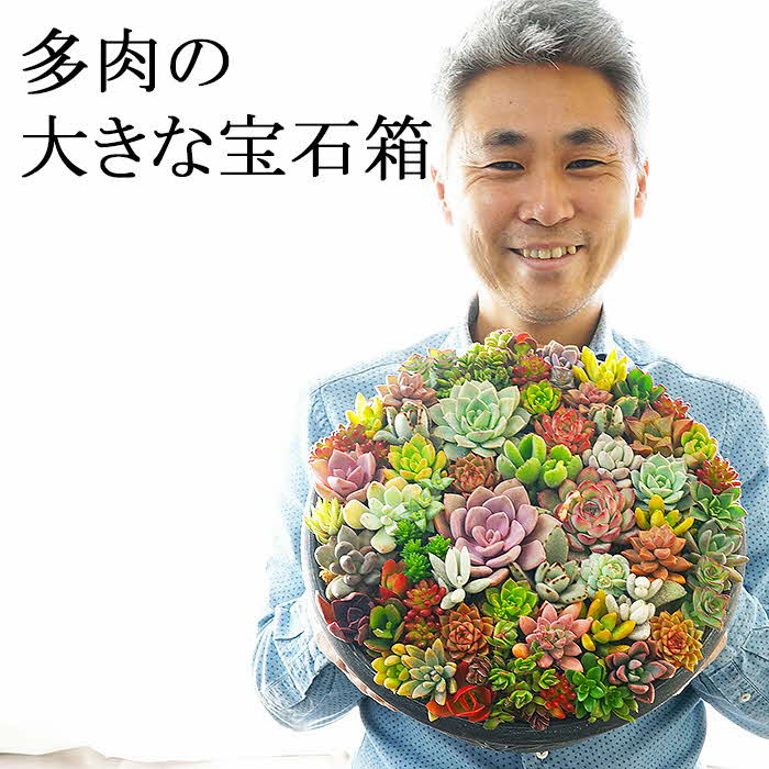 直径約27cmの大きな鉢に、色とりどりの多肉植物が敷き詰められて、まるで宝石箱のよう!品種はおまかせとなります。