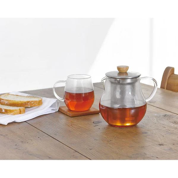 HARIO リーフティーポット・ピュア[CHEN-36T] ※離島への配送…8,000 円 大きい茶こしのティーポット。 茶葉が広がり、かつ少量のお湯でも抽出しやすいように大きな茶こしを付けました。 紅茶にフルーツティーを入れてアレンジティーも愉しめます。 茶こしを外せば、電子レンジでもご使用いただけます。 ※離島への配送不可(北海道・沖縄本島は可) 【サイズ】 幅 133 × 奥行 101 × 高 118 mm 口径 65 Φ 実用容量:360 ml 満水容量:450 ml カップ数:2杯用 【素材】 ガラス:耐熱ガラス 茶こし:ステンレス 【備考】 食器洗い乾燥機使用可能 【製造/加工の内容】 主たる工程は古河工場で加工 - 常温便