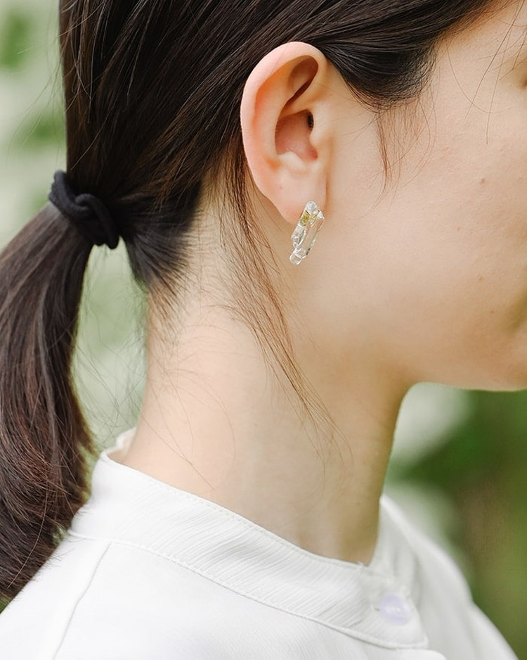 湖面に差し込みきらきらと反射する、やさしく澄んだ光。 波うつようにやわらかく輝いて、ナチュラルな雰囲気を演出します。 *クリップ式イヤリング *ピアスとイヤリングは、1個の商品につき左右ペアでのご用意となります。 ※ハンドメイドのため、形状に個体差が出る場合がございます。 ※アクセサリーの金具は、体質によってかゆみ・かぶれが生じる場合があります。(金属アレルギー等)。皮膚に異常を感じた時はご使用をお止めいただき、皮膚専門医にご相談ください。 ※離島への配送不可(北海道・沖縄本島は可) ※着日指定不可 【サイズ】 ガラス大きさ 32×21(mm) 【素材】 チャーム:耐熱ガラス 金具:真鍮・ゴールドメッキ ガラス・金具接着部:UVレジン(紫外線硬化樹脂)