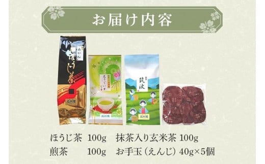 容量 | ほうじ茶(100g) 抹茶入り玄米茶(100g) 煎茶(100g) お手玉5個(40g×5) |