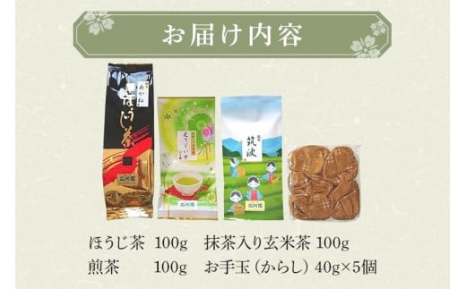 容量 | ほうじ茶(100g) 抹茶入り玄米茶(100g) 煎茶(100g) お手玉5個 お手玉(からし)40g×5個 |
