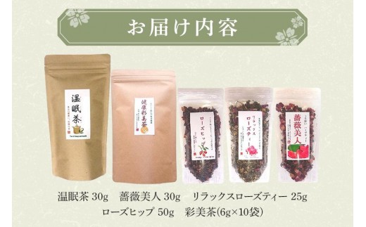 容量 | 温眠茶(30g) 薔薇美人(30g) リラックスローズティー(25g) ローズヒップ(50g) 彩美茶(6g×10袋) |