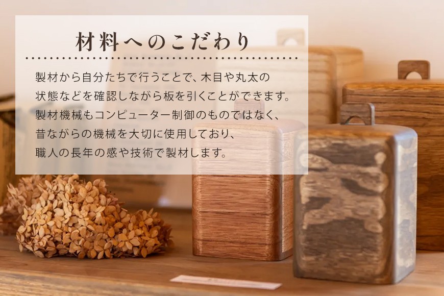 | 容量 | Sサイズ:22.5cm×14cm×8cm(外寸) Mサイズ:26.5cm×14cm×8cm(外寸) 原材料:秋田桐(無垢材ですので、木目は一つ一つ異なります) |
