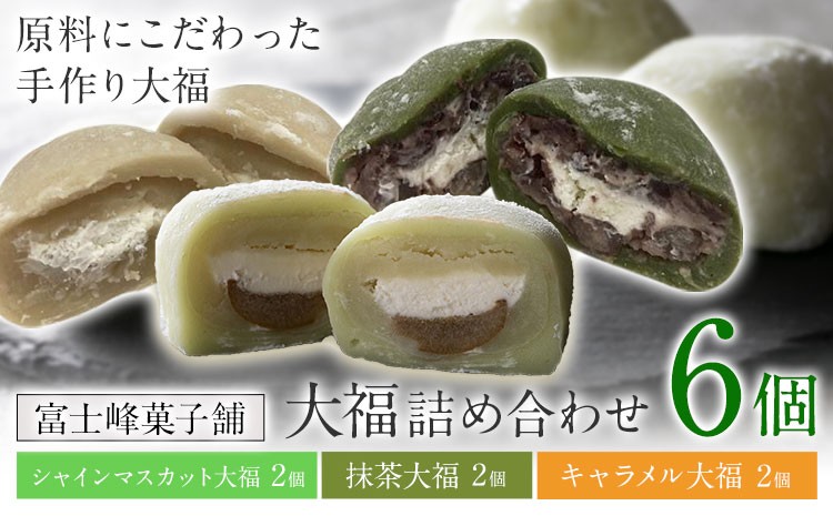 チョイスPayポイントと交換できる品 原料にこだわった手作り大福。3種類の味をぜひご堪能ください。 和菓子 大福6個詰め合わせ シャインマスカット大福 抹茶大福 キャラメル大福 3種 各2個ずつ 富士峰菓子舗《30日以内に出荷予定(土日祝除く)》 和菓子 手作り 手土産 お饅頭 もちもち