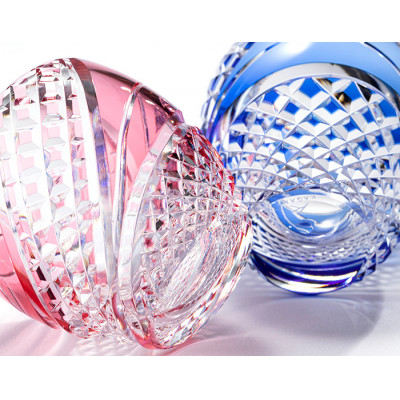 江戸切子の「魚子」紋様を基本に、より独創的なデザインとなっており、角度によって違った表情が楽しめる冷酒杯です。
