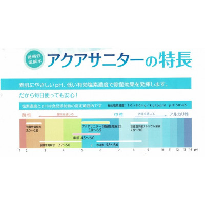 | 容量 | ■お礼品の内容について ・アクアサニター[1L×3個] 原産地:茨城県龍ヶ崎市 使用期限:製造日から半年 ・詰替え用ボトル[1本] 原産地:茨城県龍ヶ崎市 ■原材料・成分 希塩酸 (次亜塩素酸ナトリウム、食塩を使用していません。) 希塩酸電気分解:微酸性(pH5.0~6.5) 充填時40ppm以上※ ■注意事項/その他 ※開封後は1ヶ月以内に使い切っていただくことをおすすめいたします。 ※製造日(未開封)より半年以内にお使いください。 ※飲料用ではありません。 ※幼児や子どもの手の届かない所に保管してください。 ※直射日光や紫外線を避け、冷暗所で保管を行って下さい。 ※容器への強い衝撃はおさけください。容器が破損することがあります。 |