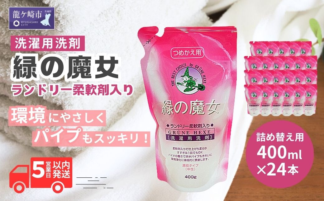 手肌にも優しい成分で汚れを落とし、排水パイプの汚れも綺麗にしてくれる優れもの! 緑の魔女ランドリー柔軟剤入り400g(詰め替え用)×24本セット | 洗剤 パイプクリーナー 詰まり 臭い 匂い 排水溝 環境配慮 洗濯槽 手肌 優しい 汚れ 蛍光増白剤 漂白剤 不使用 赤ちゃん 安心 お中元 お歳暮 ギフト 大掃除 フローラル 茨城県 龍ケ崎市