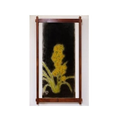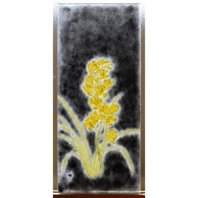 工房では、毎年数種のシンビジウムが咲きますが、特にこの黄色の花が工房を彩ってくれます。この作品は、沢山の花を豪華に咲かせ、細長い葉と好対照をなすシンビジウムをモチーフにしました。