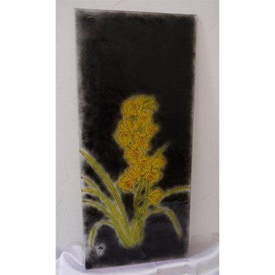 花の部分は、イエローのガラスパウダーを融着させ、周囲には黒いパウダーガラスを被せて、幻想的に植物を浮き立たせました。 最後に茶色のグリザイユ(ステンドグラ専用顔料)で極細く輪郭絵付けをしています。この作品は、透過光で見る時と、反射光で見る時では、表情が異なります。