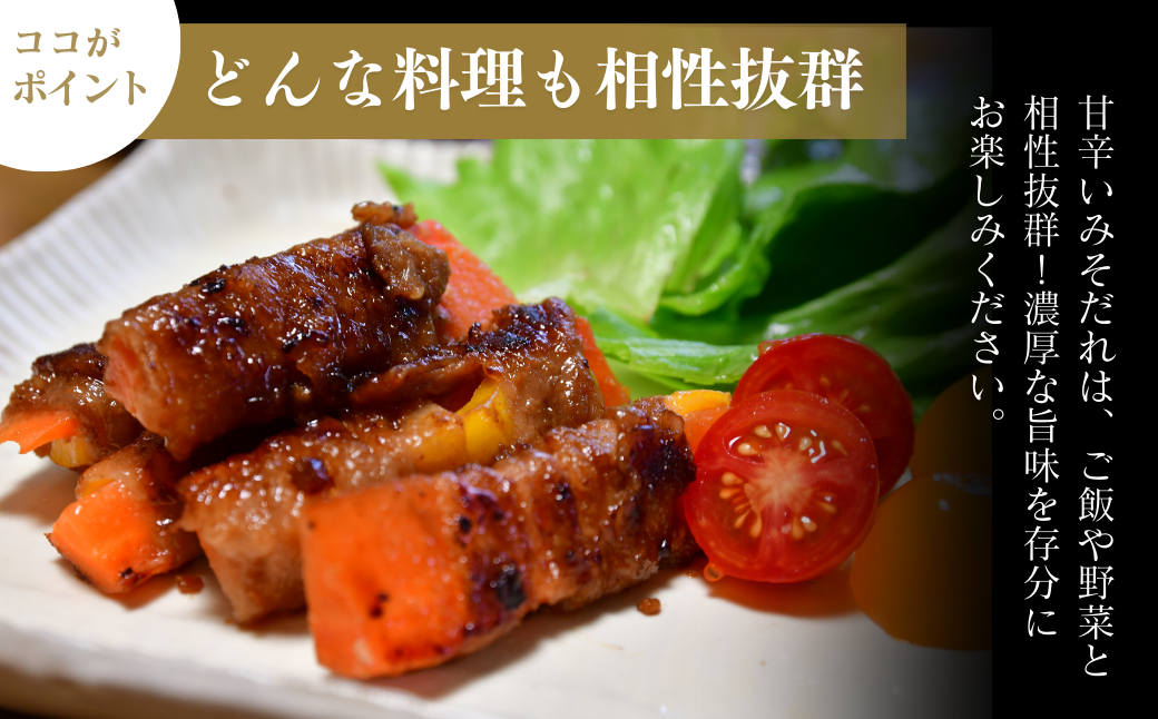 香ばしいみその風味が食欲をそそり、柔らかくジューシーな美味しさです。サッと焼いて、焼肉や丼ぶりに。野菜と一緒に炒めても、ごはんがすすむ一品です。