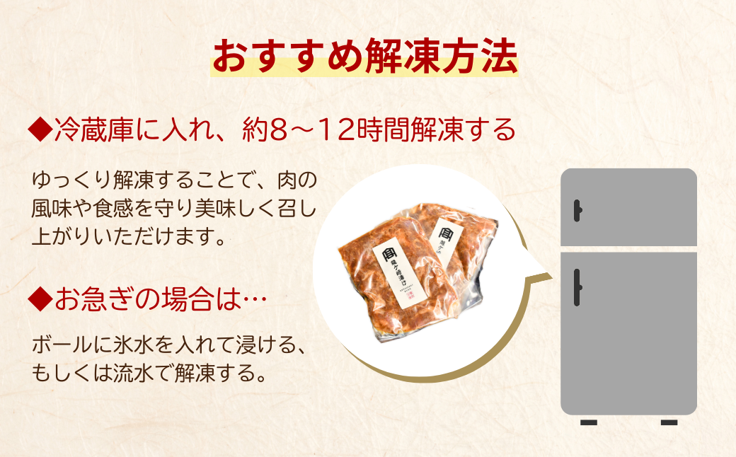 | 容量 | ■選べる内容量 500g:250g×2袋 1kg:250g×4袋 ■製造地 茨城県龍ケ崎市 ■原材料 豚肉(茨城県産)、味噌(大豆:遺伝子組み換えでない)、砂糖、清酒、水飴、玉ねぎ、にんにく、生姜、ごま油、ごま、食塩、唐辛子 / アルコール、調味料(アミノ酸等) ※一部にごま・大豆を含む |