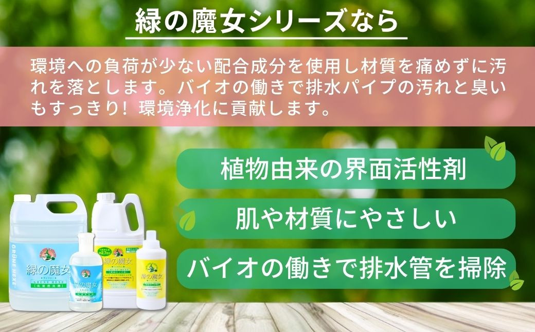 緑の魔女シリーズは天然植物由来の界面活性剤を使用しており、地球にやさしい洗剤です。使用後の水は、パイプクリーナーとして働き、バイオの力で排水パイプもきれいにします。