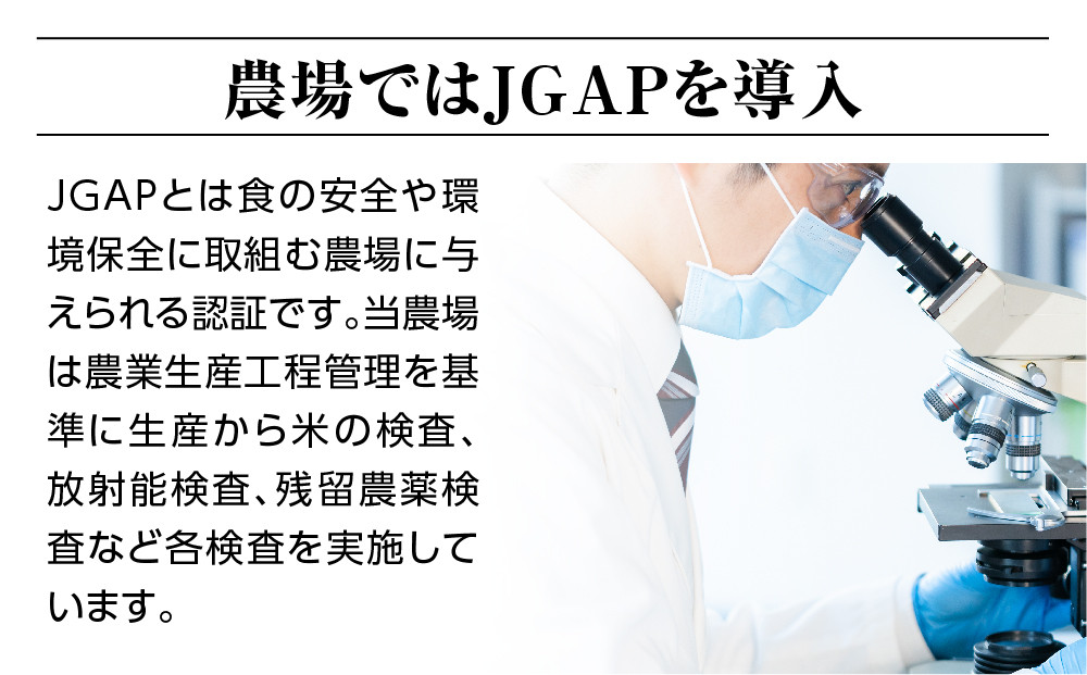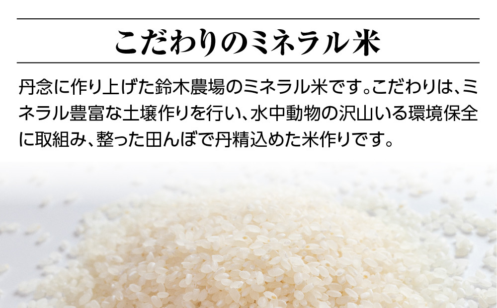 丹念に作り上げた鈴木農場のミネラル米です。こだわりは、ミネラル豊富な土壌作りを行い、水中動物の沢山いる環境保全に取組み、整った田んぼで丹精込めた米作りです。農場ではJGAPを導入しました。JGAPとは食の安全や環境保全に取組む農場に与えられる認証です。当農場は農業生産工程管理を基準に生産から米の検査、放射能検査、残留農薬検査など各検査を実施し、食の安全を確認しています。顧客さまの注文を受けてから精米して新鮮なお米をお届けします。