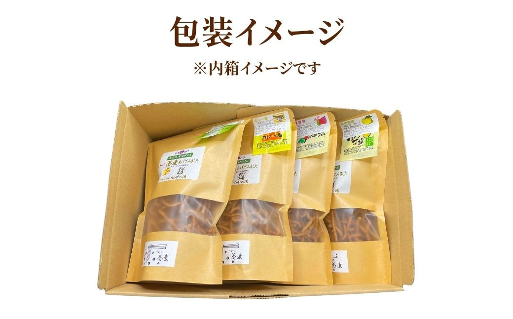 手打ち常陸秋そばを揚げたスナックです。蕎麦の風味を4種のフレーバーで楽しめます。