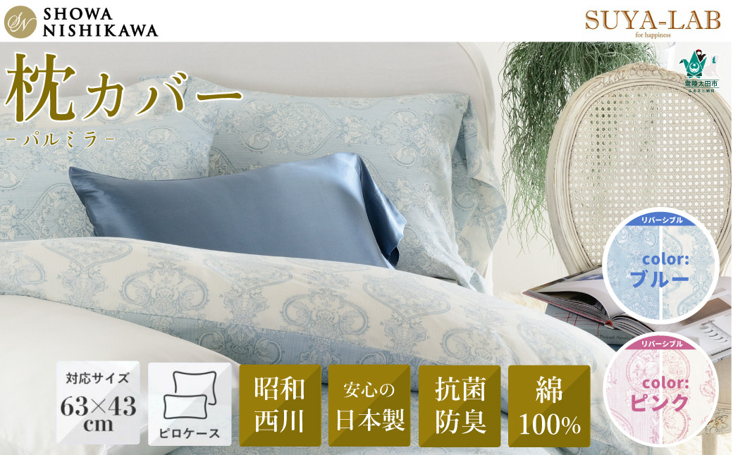 昭和西川 スヤラボ ピローケース パルミラ (ピンク・ブルー) 封筒式 枕カバー 63×43対応 | 茨城県 常陸太田市 SHOWA NISHIKAWA 西川 高級 まくらカバー 日本製 綿100% コットン サテン ダマスク柄 光沢 軽い ポリジン加工 抗菌 防臭 銀イオン ニオイ 抑制 高品質 63cm 43cm 快眠 手触り 極上 肌触り SUYA-LAB すやらぼ リバーシブル 青