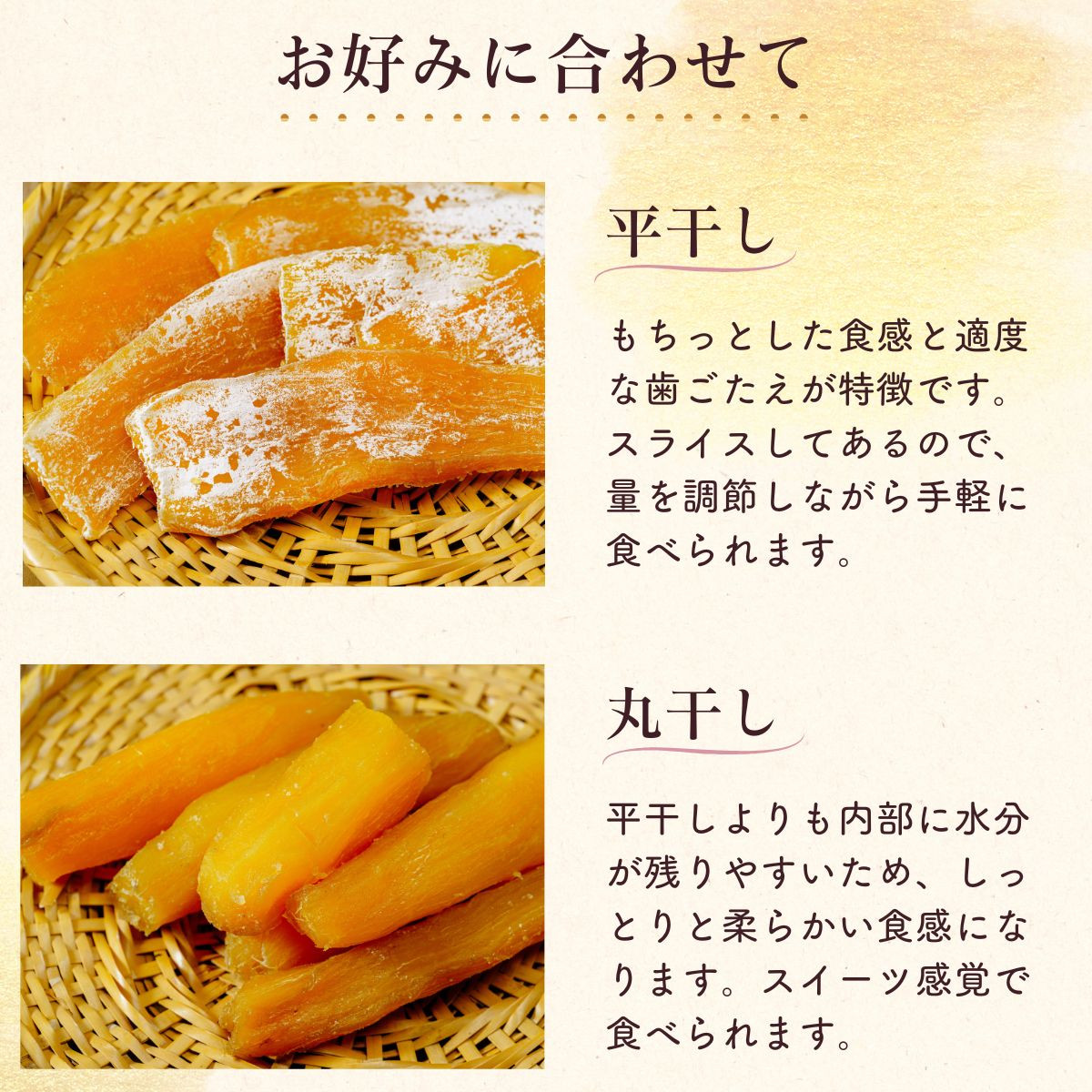 低温熟成し、天日干しにこだわった干し芋です。