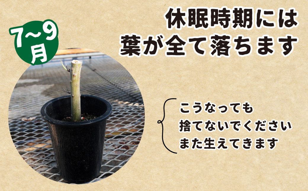 夏場が休眠期となっており、葉がすべて落ちますが、また葉っぱが出てきます。