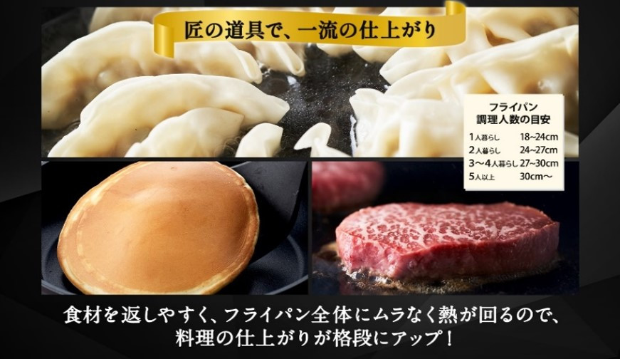 ◆通常のフライパンよりも底面が広いので、ステーキやすき焼き、餃子などに適しています。