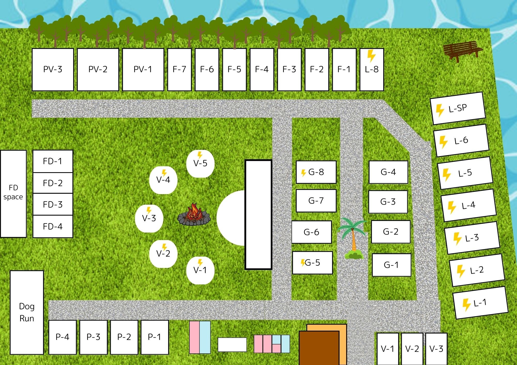 管理棟(センターハウス)や炊事場、トイレ、シャワー棟に近い便利なエリアです。