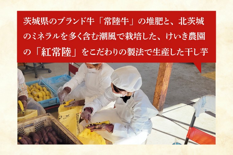 茨城県のブランド牛常陸牛の堆肥と、北茨城のミネラルを多く含む潮風で栽培した、けいき農園の「紅常陸」をこだわりの製法で生産した干し芋です。