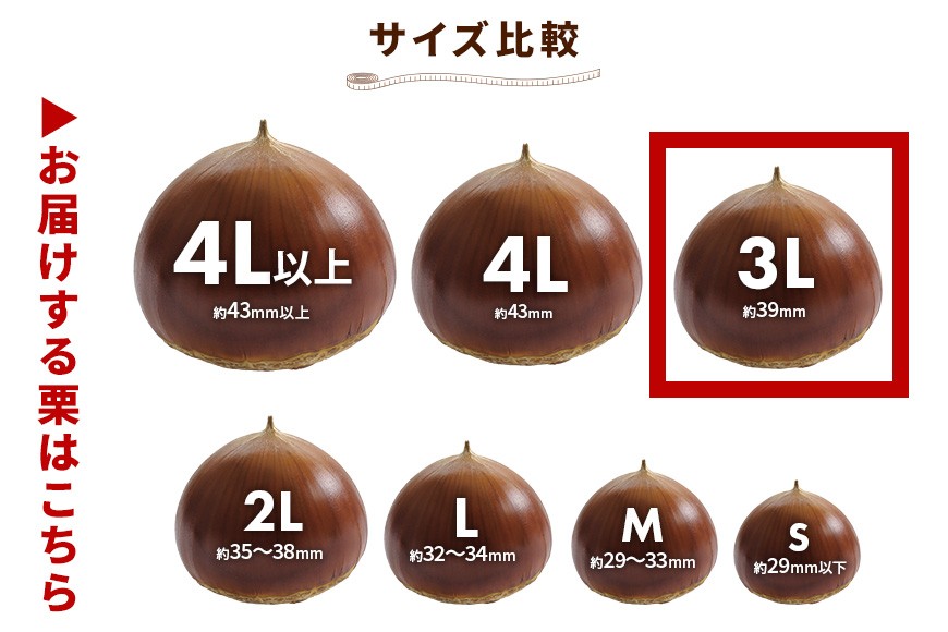 | 容量 | 生栗 3L(25g~32g)×1kg ※サイズは地元JAの基準に準拠しております。 |