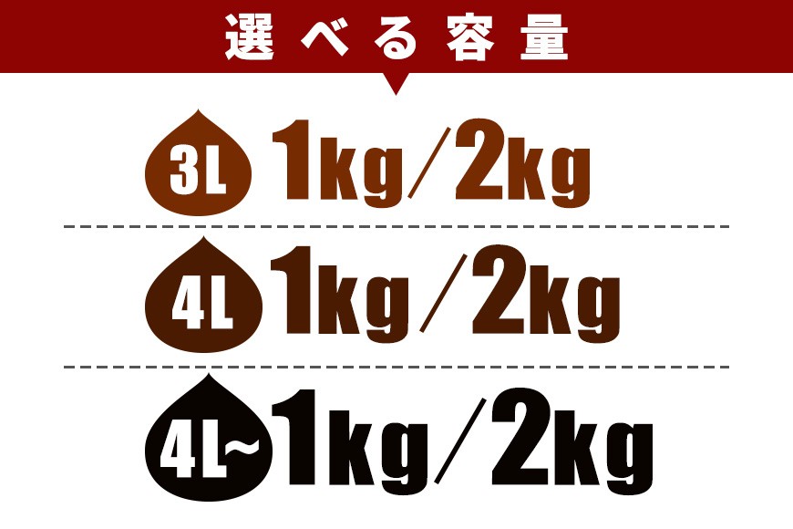 | 容量 | <大粒の3Lサイズ!!> ・生栗 3L(25g~32g)×1kg ・生栗 3L(25g~32g)×2kg <超大粒サイズ!4Lサイズ!!> ・生栗 4L(33g~37g)×1kg ・生栗 4L(33g~37g)×2kg <幻の超大粒サイズ!超特大 4L以上 メガマロン!> ・生栗 超特大 4L以上 メガマロン(38g以上)×1kg ・生栗 超特大 4L以上 メガマロン(38g以上)×2kg ※サイズは地元JAの基準に準拠しております。 |