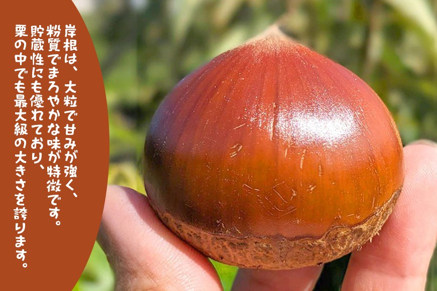 粒が大きく味も良い 収穫期:一晩生 10月中旬~下旬 【岸根(がんね)】 大粒で甘みが強く、粉質でまろやかな味が特徴です。貯蔵性にも優れており、栗の中でも最大級の大きさを誇ります。 食べると口の中でホロホロと崩れる粉質。スイーツへの加工が多いのも特徴。 甘露煮にしても美味しく食べられますが、加熱すると崩れやすいため、慎重に調理してください。 熟す時期が遅い「晩生(おくて)栗」の一種で、収穫時期・旬の時期は主に10月中旬から下旬です。 ※画像はイメージです。 冷蔵便にてお送りします。 栗は生ものです。 とてもデリケートなので日に日に乾燥して軽くなります。 お手元に届きましたらポリエチレン袋に入れ、口を折りたたみ要冷蔵で保管の上、お早めにお召し上がり下さい。 ※温湯殺虫処理済み ※機械を使わず人の目で選別しているため、不良果が混じることがあります。ご了承ください。 ※選果機にかけてサイズ選別しています。4Lサイズ以上の栗を入れてますが若干ばらつきがございます。