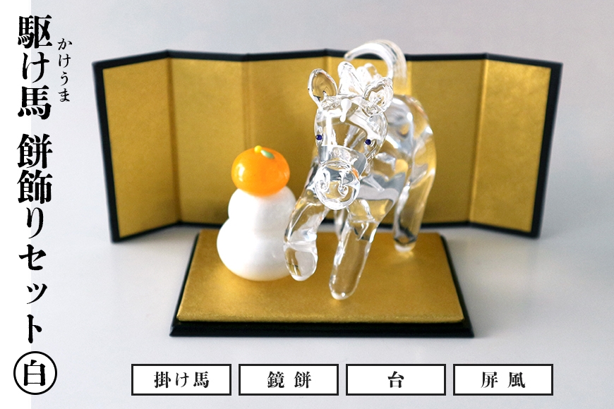 【白】駆け馬(かけうま)・餅飾りセット 令和8年 R8 2026年 干支 馬 午 鏡餅 屏風 お正月 モチーフ 茨城県 ガラス 置物 赤 黒 白 ガラス工房 神魂 笠間市 茨城県