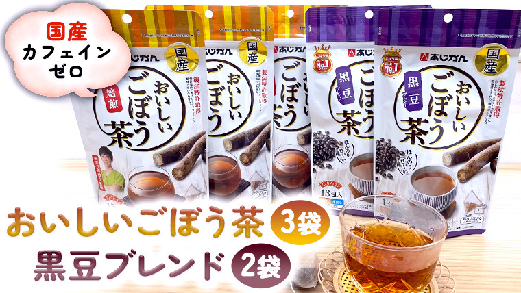 南雲吉則博士監修、ごぼう茶売上NO.1!あじかんのごぼう茶 おいしいごぼう茶3袋+おいしいごぼう茶黒豆ブレンド2袋 合計5袋セット 国産 ごぼう 黒豆 ブレンド 茶 南雲博士 監修 焙煎 あじかん 飲み比べ セット ティーパック