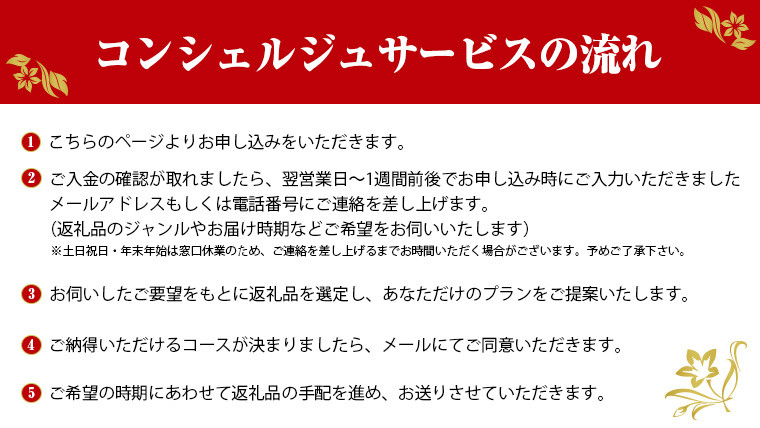 ・コンシェルジュコースの内容は入金後、年度内までに確定いただくようご協力をお願いしております。また配送時期につきましても返礼品によってお選びいただける期間を限定させていただく場合もございますので予めご了承ください。