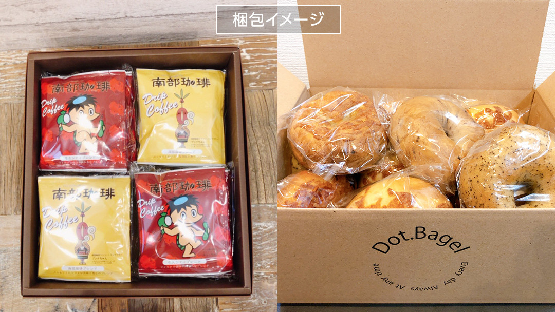 【南部珈琲】ドリップ コーヒー バッグ:常温配送 【Dot.Bagel】 おまかせ ベーグル 8個:冷凍配送 入金確認後、2~3週間程度で発送 ※別々の発送となるため、届け日が異なります。予めご了承ください。 |
