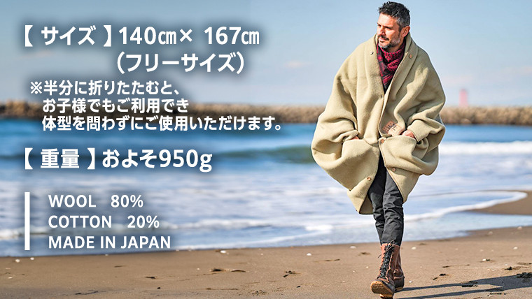 | 容量 | サイズ:140cm × 167cm(フリーサイズ) ※半分に折りたたむと、お子様でもご利用でき体型を問わずにご使用いただけます。 容量:950g WOOL:80% COTTON:20% MADE IN JAPAN |