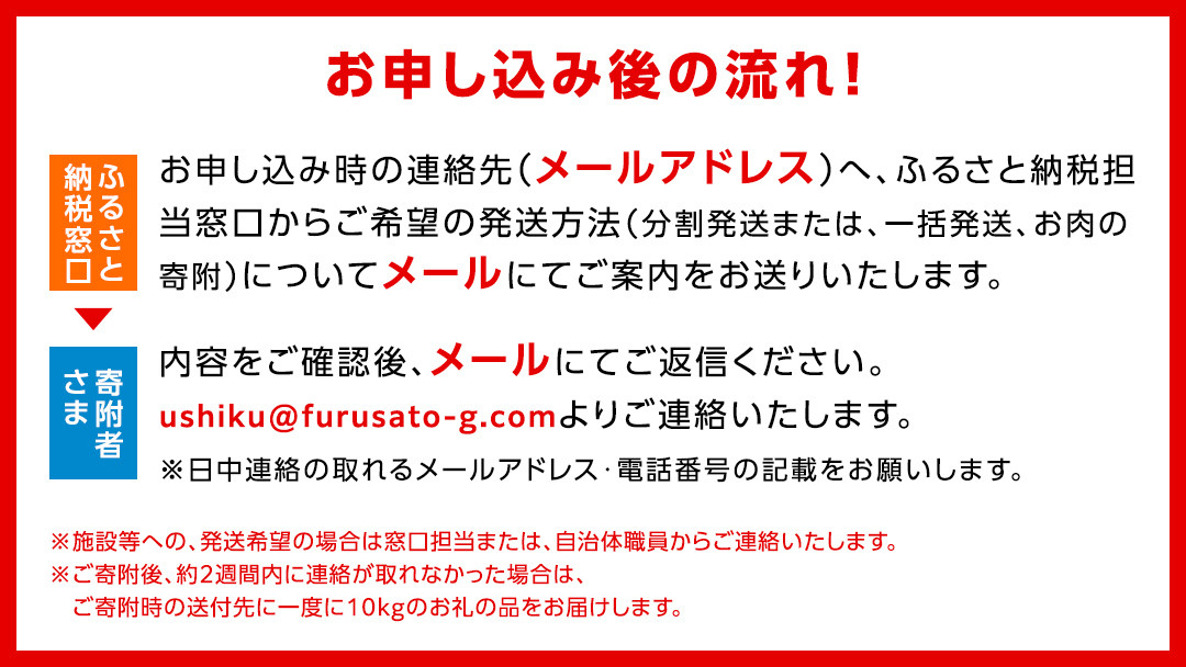 お申し込み時の連絡先へ、ふるさと納税担当窓口からご希望の発送方法(分割発送または、一括発送、お肉の寄附)について