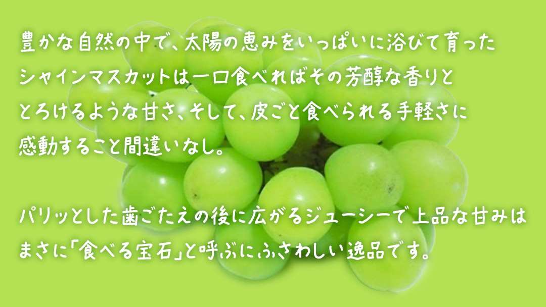 丹精込めて育てられたシャインマスカットは、パリッとした食感とジューシーな果肉が特徴。