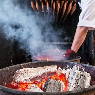 桜の薪と炭火使用。塩漬後熟成させたお肉を使ったポーク100%ソ…