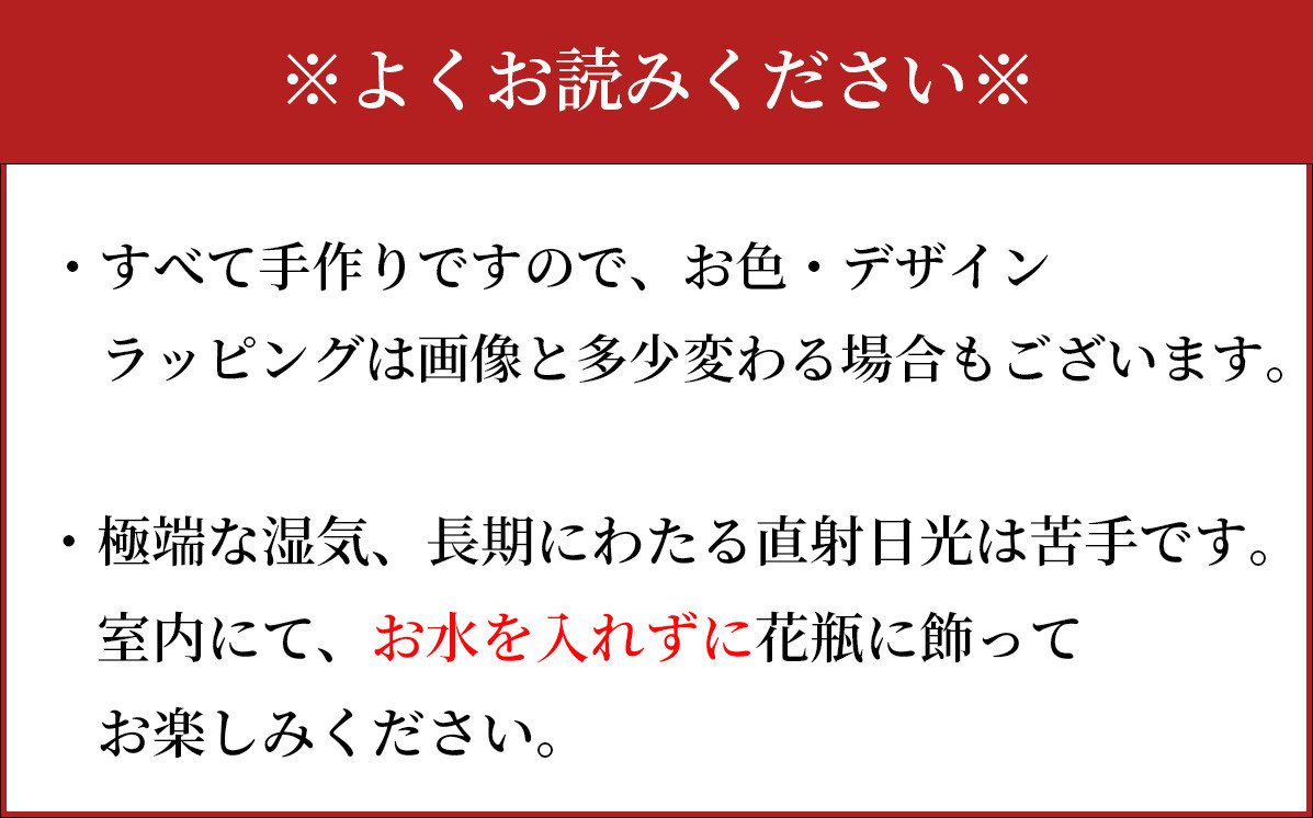 ※極端な湿気、長期にわたる直射日光は苦手です。室内にてお水を入れずに花瓶に飾ってお楽しみください。