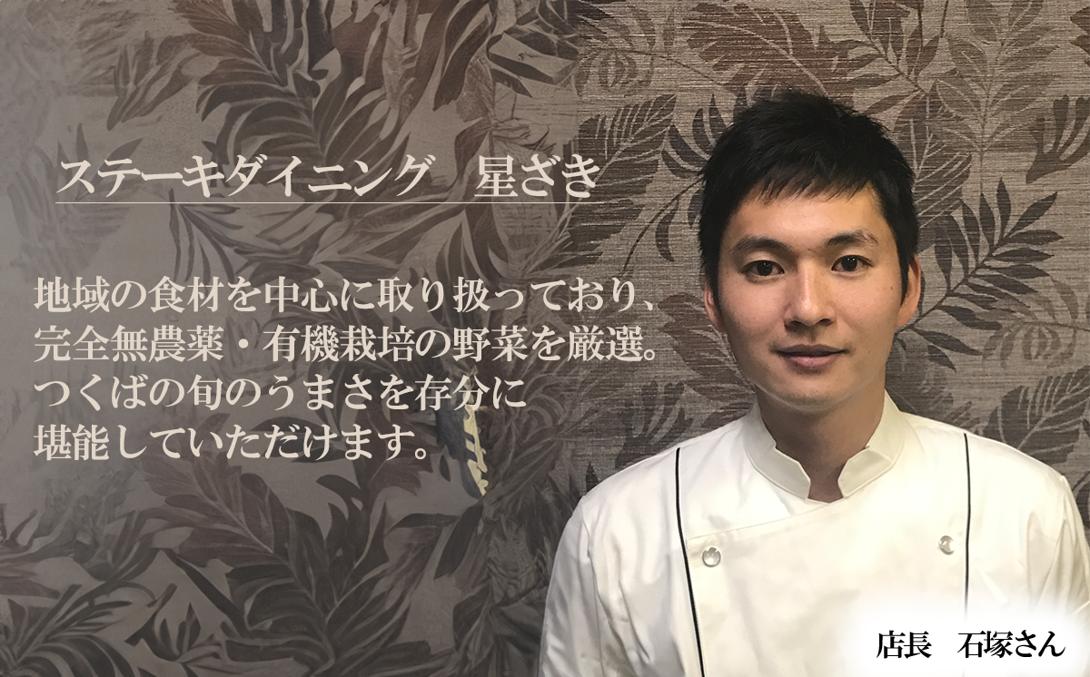 多くの方々にとって特別な記憶を作りたい、当店でお食事を楽しんでいただきたいと思っています。そして茨城県つくば市に根ざし、『つくばでステーキを食べるなら星ざきだよね』と仰って頂ける様な店を目指してまいります。