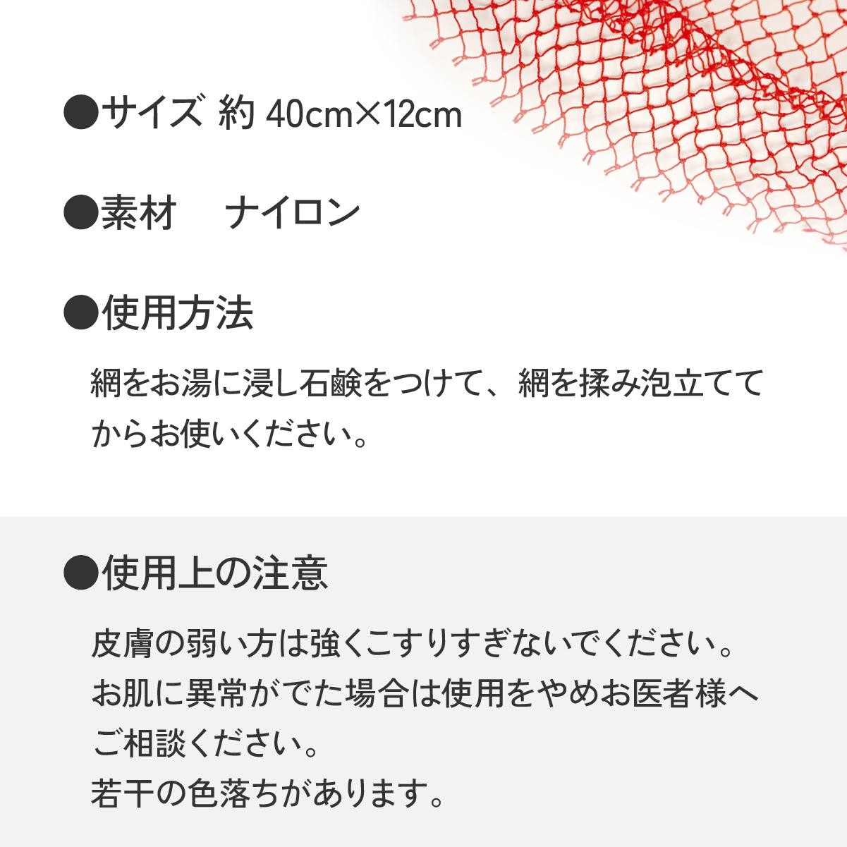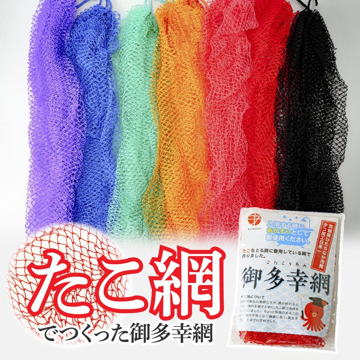 タコをとる時に使用している網で作ったボディタオルです。 とても丈夫で「あかすり」としてもご使用いただけます。 網なので泡立ちも良く、尚且つ泡切れも良いので清潔です。 ひとつひとつ手作りしています! ■色 全6色(赤・ピンク・オレンジ・ブルー・ライトグリーン・パープル) この中から違う色を4色お届け致します。 ※色はお任せのため、お選びいただけません。 ■サイズ 約40cm×12cm ■素材 ナイロン
