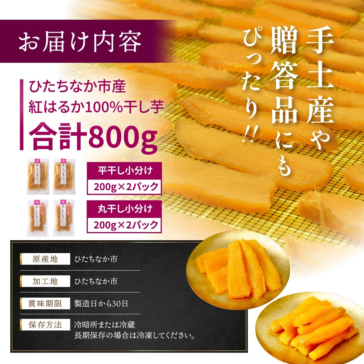 | 容量 | ■お礼品の内容について ・上品な甘みの干し芋[丸干し200g×2パック 平干し200g×2パック] 原産地:ひたちなか市/製造地:ひたちなか市/加工地:ひたちなか市 ■原材料・成分 茨城県産サツマイモ |