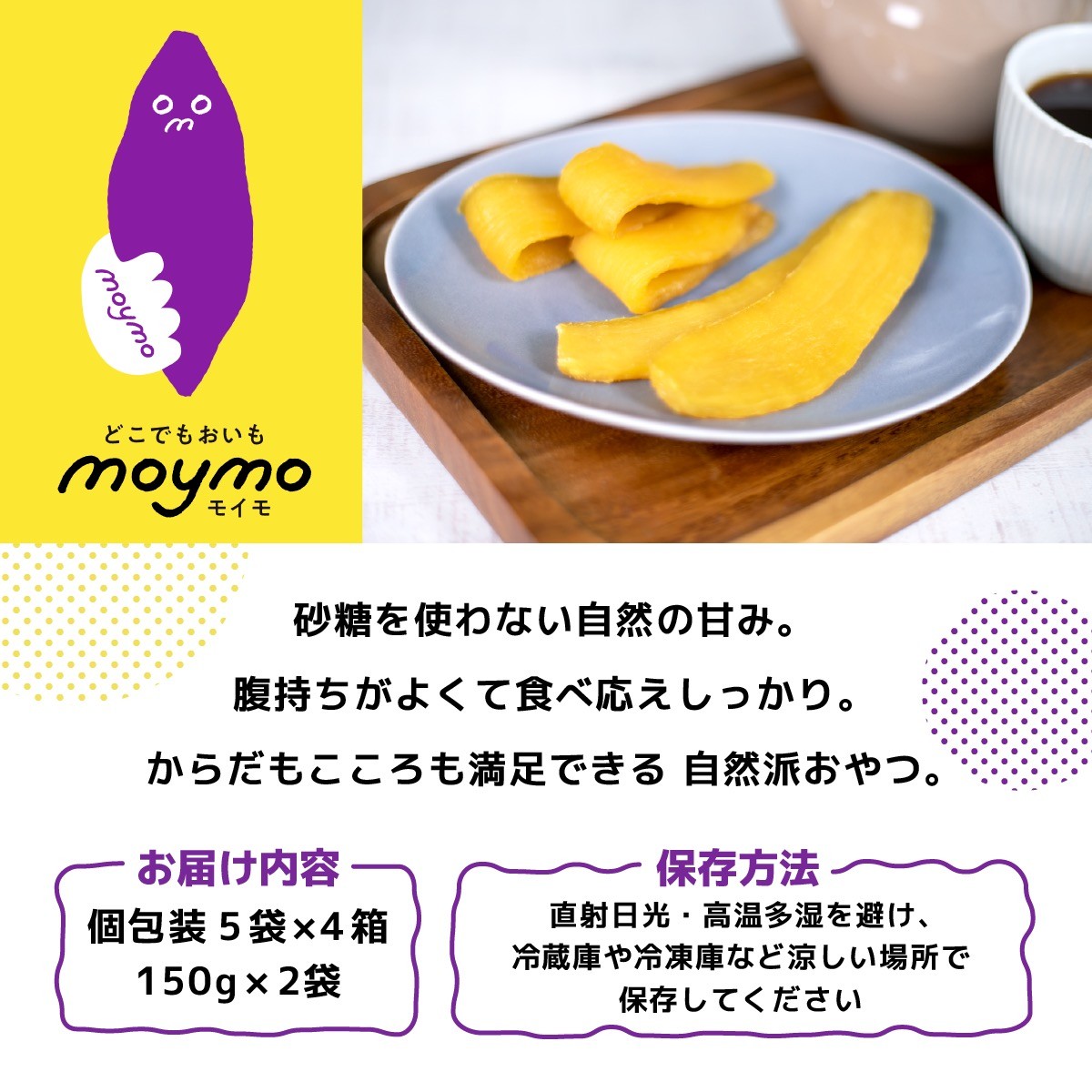 気軽に持ち歩きやすいジップ付きの袋で、小腹が減ったらぱくっと食べたり、友だちとシェアしたり、たまには大好きなペットともシェアしたり。ヘルシーなお芋をいつでもどこでも楽しめる。どこでもおいも。『moymo(モイモ)』です。