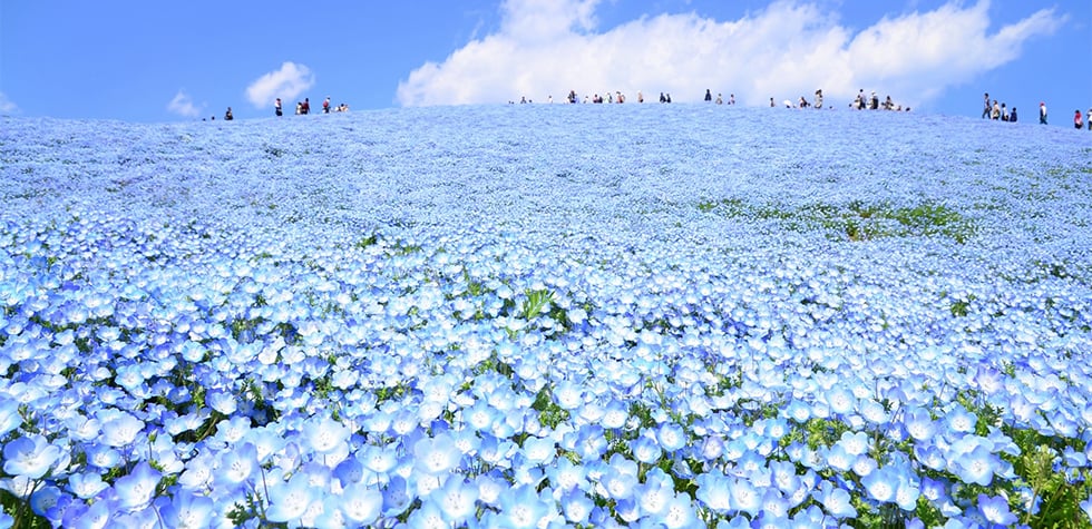 ひたちなか市は茨城県の中央部、県都水戸市に隣接。暖かな春が訪れる頃、国営ひたち海浜公園では、香り高く色鮮やかなスイセン、カラフルで可愛らしいチューリップ、そして、『死ぬまでに行きたい!世界の絶景』と評され空の青・海の青のハーモニーが美しいネモフィラが見頃を迎え、大勢の観光客で賑わいます。夏に突如姿を現す新緑のコキアは、秋にかけて赤と緑のグラデーションを表現し、10月頃には『紅葉コキア』として一面を真っ赤に染め上げます。その他、市内の馬渡はにわ公園では、毎年6月に美しい花しょうぶが咲き誇り、白と紫の涼しげな花景色は、来園者に初夏の訪れを感じさせてくれています。